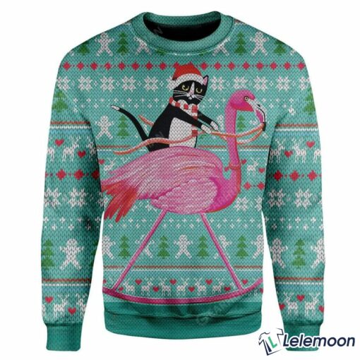 Picture this: a jolly cat sporting a Santa hat, riding atop a vibrant flamingo through a winter wonderland. The design is a playful blend of Christmas cheer and tropical vibes, creating a delightful contrast that is sure to turn heads at every holiday gathering. The attention to detail is impeccable, with the intricate stitching capturing the playful interaction between the feline and the flamboyant bird.