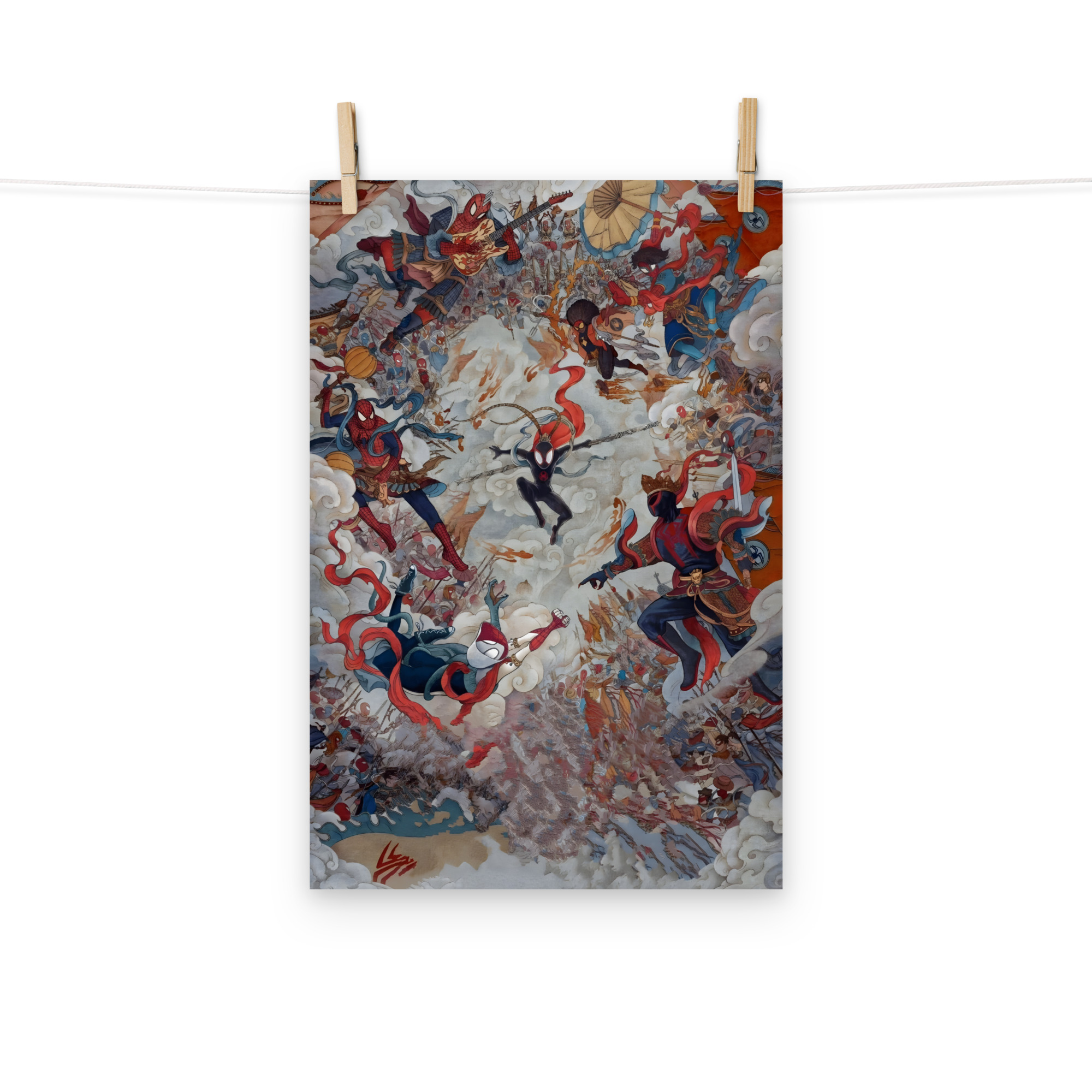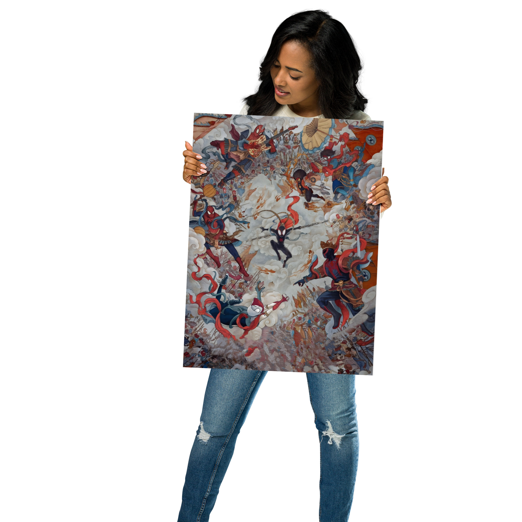 Immerse yourself in the vibrant world of Spider-Man with our exclusive Chinese Spider-Verse Wukong Satin Portrait Poster. This unique piece of art features Spider-Man in the style of Sun Wukong, the Monkey King, from the classic Chinese novel “Journey to the West.”