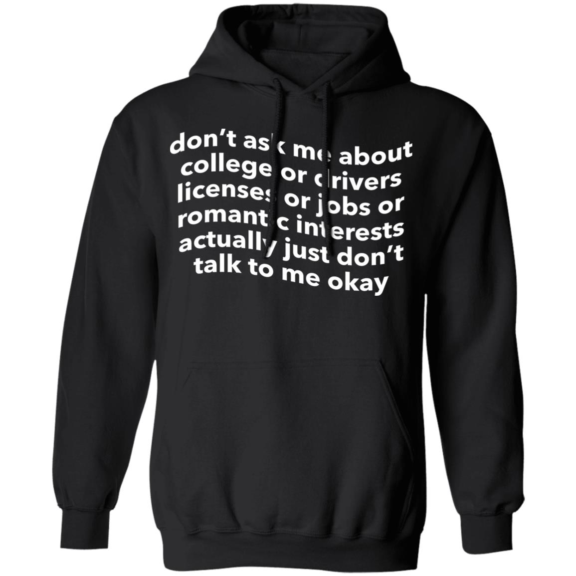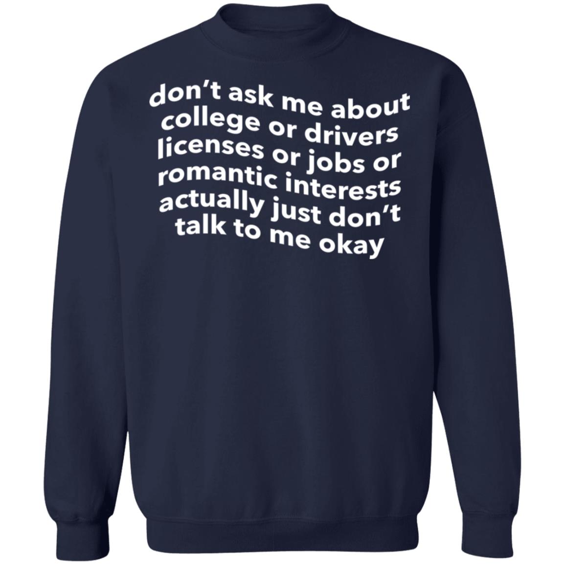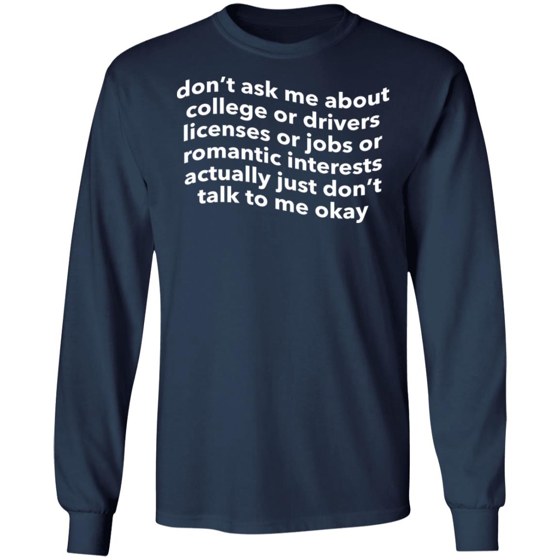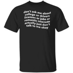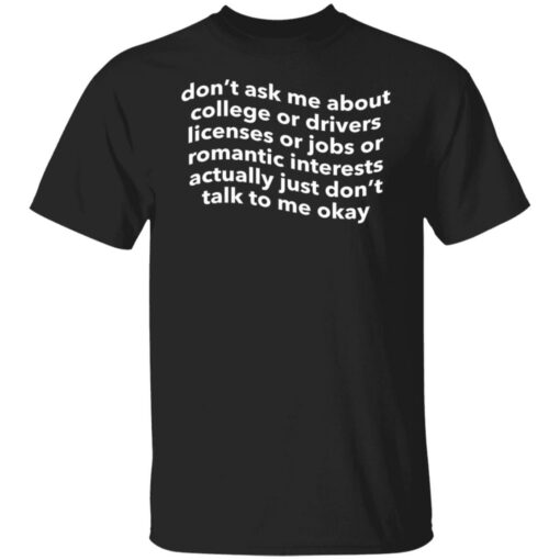 Let’s face it, you don’t need to ask me about anything and I’m not going to tell you about anything either. So just don’t ask me about these things and we’ll be fine Show everyone your lack of interest or urgency with this hilarious shirt that’s guaranteed to make you laugh, especially the next time you’re asked about the college admissions process. Don’t ask me about college or drivers licenses or jobs or romantic interests actually just don’t talk to me okay shirt is perfect for when you want to express your feelings.
