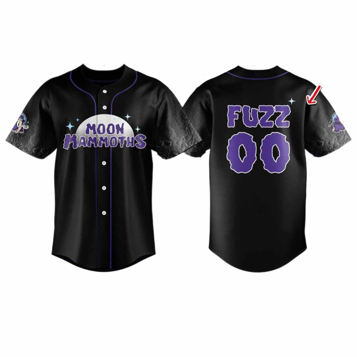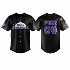 The jersey is beautifully designed, made from cool material, suitable for cheering or simply walking around town. The shirt stands out on the jet black background like the cosmic sky. On the chest, the words “MOON MAMMOTHS” are artistically curved next to the image of the moon and sparkling stars, evoking a magical night sky. On the back, the name “FUZZ” and the giant number “00” are graffiti style.
