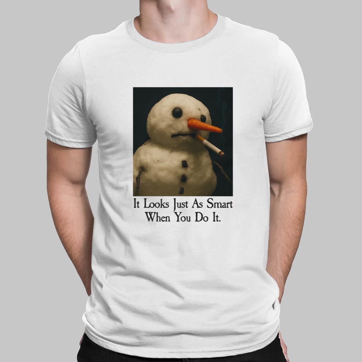 The It Looks Just As Smart When You Do It Snowman Shirt is a crisp white short-sleeve tee, made from soft, breathable fabric ideal for all-day comfort. The star of the show is a snowman graphic, complete with a carrot nose and coal eyes, puffing on a cigarette with a deadpan expression that screams nonchalance. Below the image, the text “It Looks Just As Smart When You Do It” is printed in bold black letters, delivering a punchline that’s both witty and slightly judgmental. The minimalist design on the white background ensures the humor shines through, making it a versatile pick for casual wear or themed gatherings.
