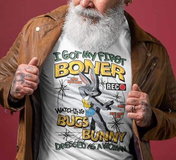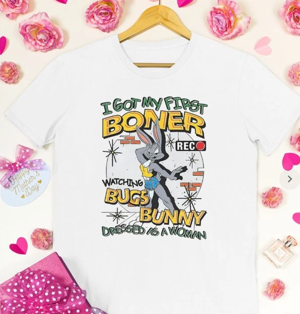 The t-shirt is made from high-quality materials and features a comfortable fit, making it perfect for everyday wear. Its bold and colorful design is sure to stand out in any crowd, and the phrase “Rabbit I Got My First Boner Watching Bugs Bunny Dressed As A Woman” adds a fun and cheeky touch to the overall aesthetic.