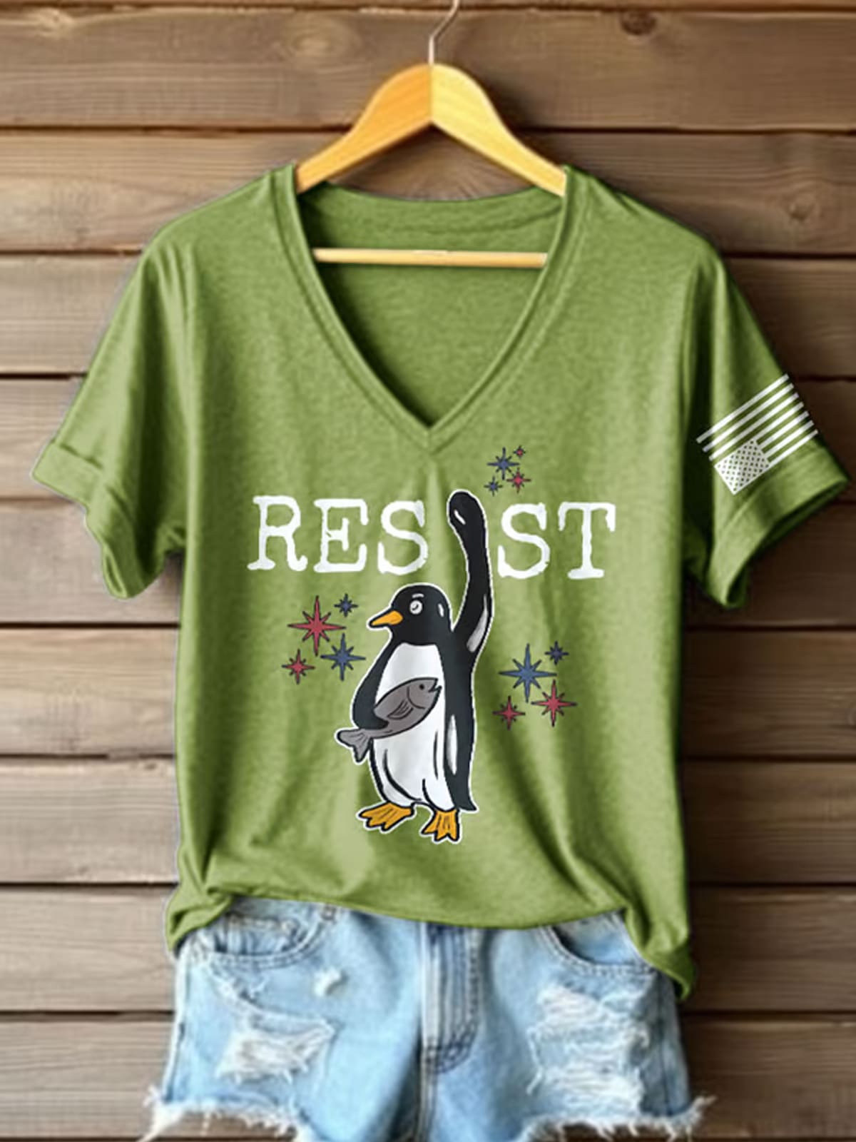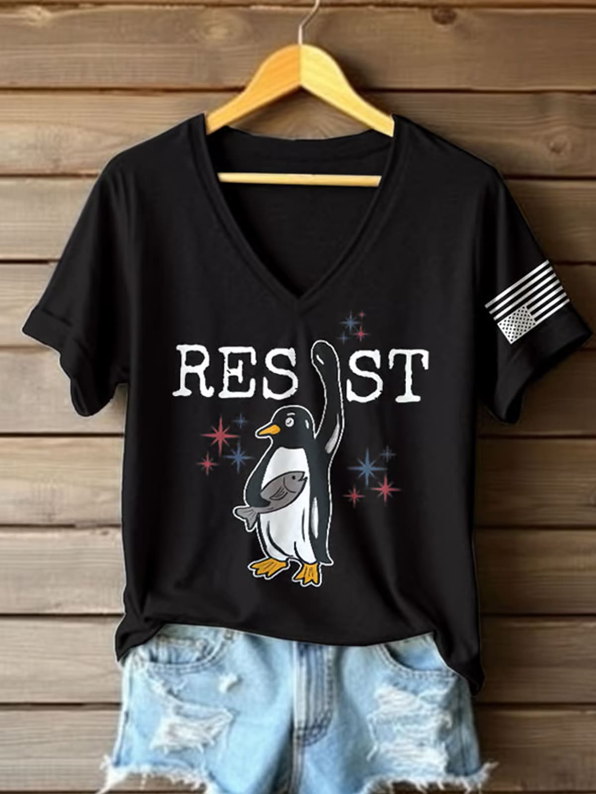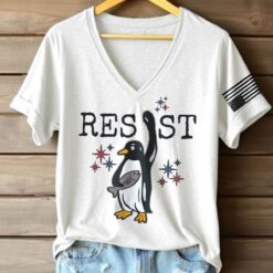 The Retro Penguins Resist Penguins Against Tariffs Print T-Shirt is a white V-neck with rolled sleeves, styled with distressed denim shorts in the image for a casual vibe. The front features the word “RESIST” in bold, distressed black letters, paired with an illustration of a penguin raising a flipper in defiance, holding a fish. Surrounding the penguin are small red and blue starbursts, adding a patriotic flair. On the right sleeve, a black-and-white American flag patch ties the look together, giving this tee a retro, activist edge that’s both fun and fierce.